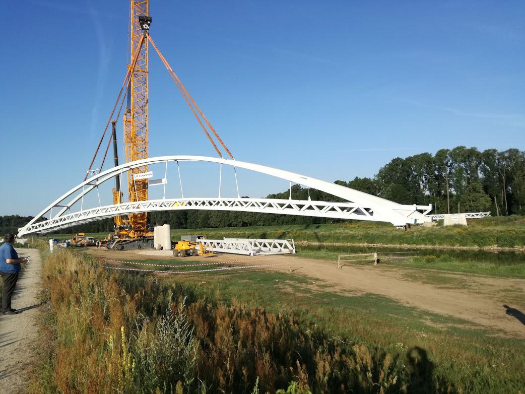 Nosná konštrukcia sa po dieloch dovážala na stavbu a za pomoci podporných konštrukcií sa spájala do troch celkov: hlavné pole a dve predpolia. Pre osadenie konštrukcie hlavného pola a predmostí sa použil žeriav 750 t, pre ktorý musela byť zriadená špeciálna spevnená plocha ohraničená larstenami a zasahujúca čiastočne aj do toku Moravy. Dňa 25.7.2019 najväčší žeriav v českej a slovenskej republike od dodávateľaHanyš – jeřábnické práce, s.r.o.,zdvihol oceľovú konštrukciu a položil ju na piliere. Oceľová konštrukcia hlavného pola o hmotnosti 221 t sa kládla s pojazdom na vzdialenosť 37 metrov.
