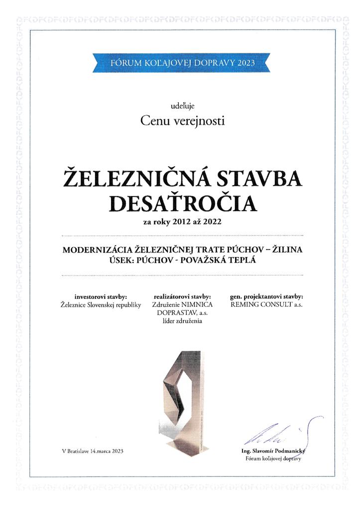 🏆 Cena verejnosti „Železničná stavba desaťročia 2012-2022“, ktorá vzišla z internetového hlasovania.