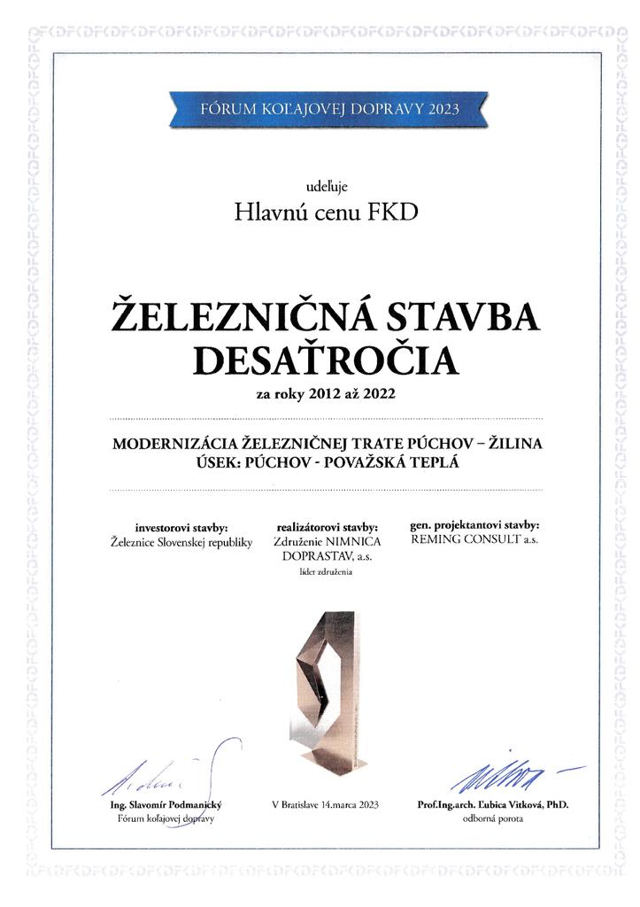 Na slávnostnom Galavečeri konanom pri príležitosti 17. ročníka konferencie Fórum koľajovej dopravy dňa 14. marca 2023, boli vyhlásené výsledky v rámci 1. ročníka súťaže CENA FKD „ŽELEZNIČNÁ STAVBA DESAŤROČIA 2012 – 2022″.